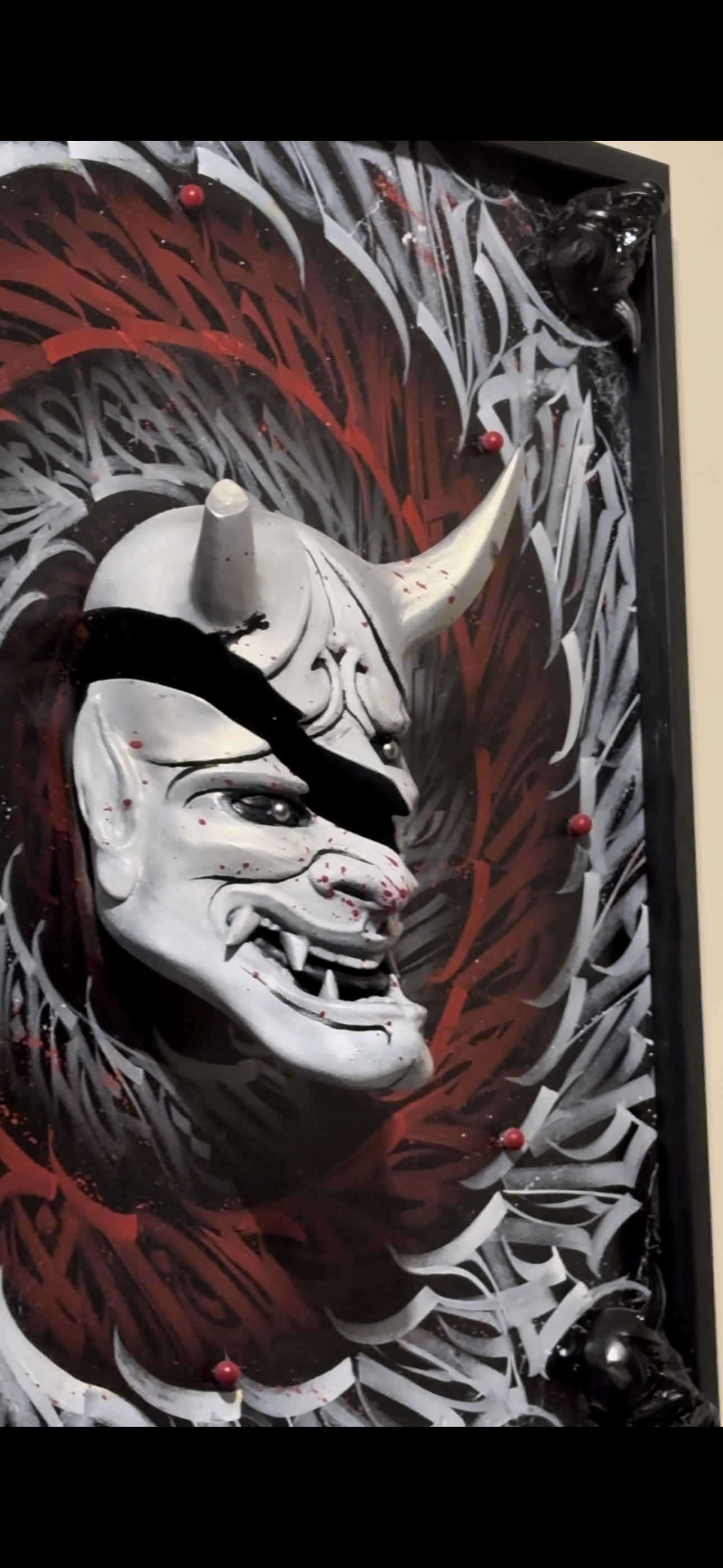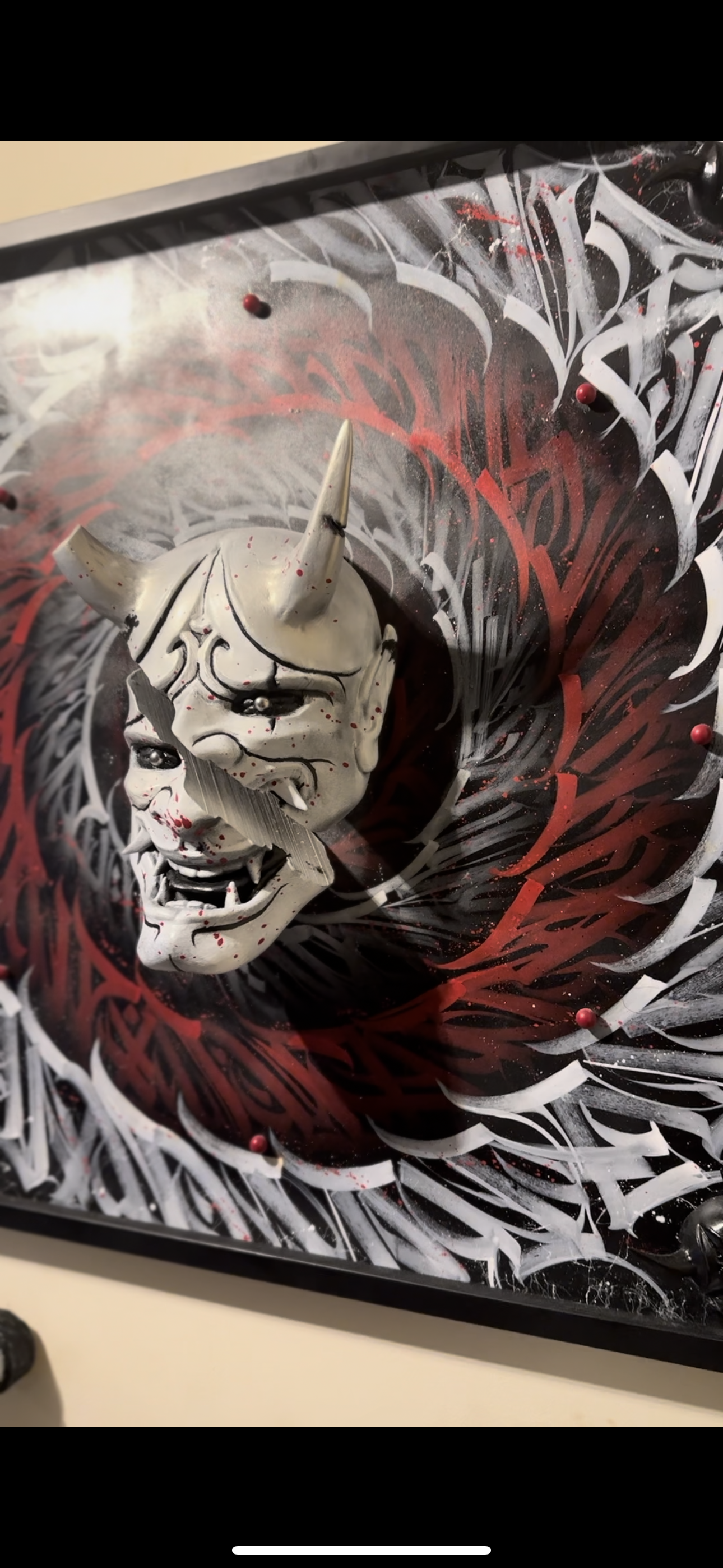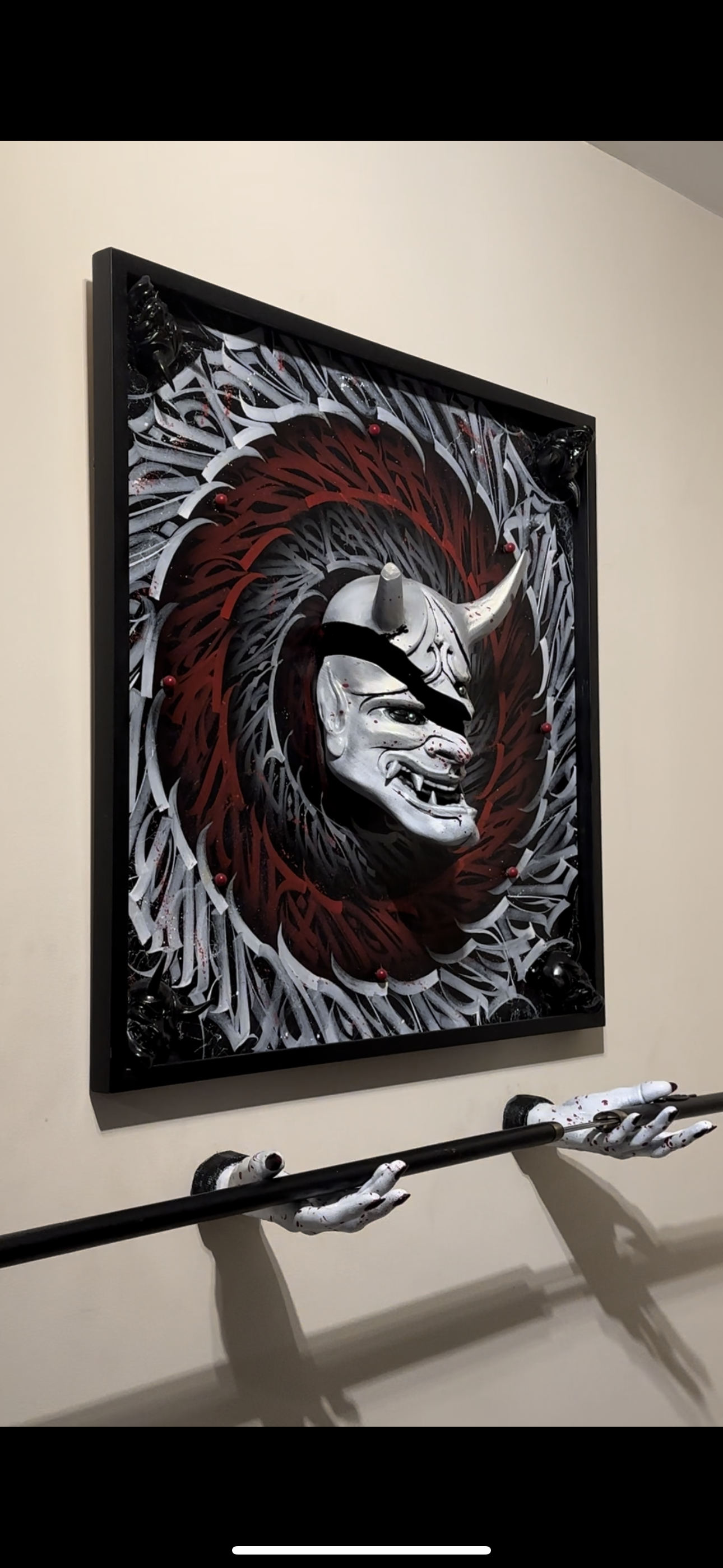 This custom art piece features a 3D-printed Oni mask, complemented by a striking background created in collaboration with the talented artist Scripta. Adding to its dramatic effect, sculpted hands hold a real katana, merging traditional Japanese elements with contemporary art. This unique piece blends craftsmanship and artistry, creating a powerful visual centerpiece.