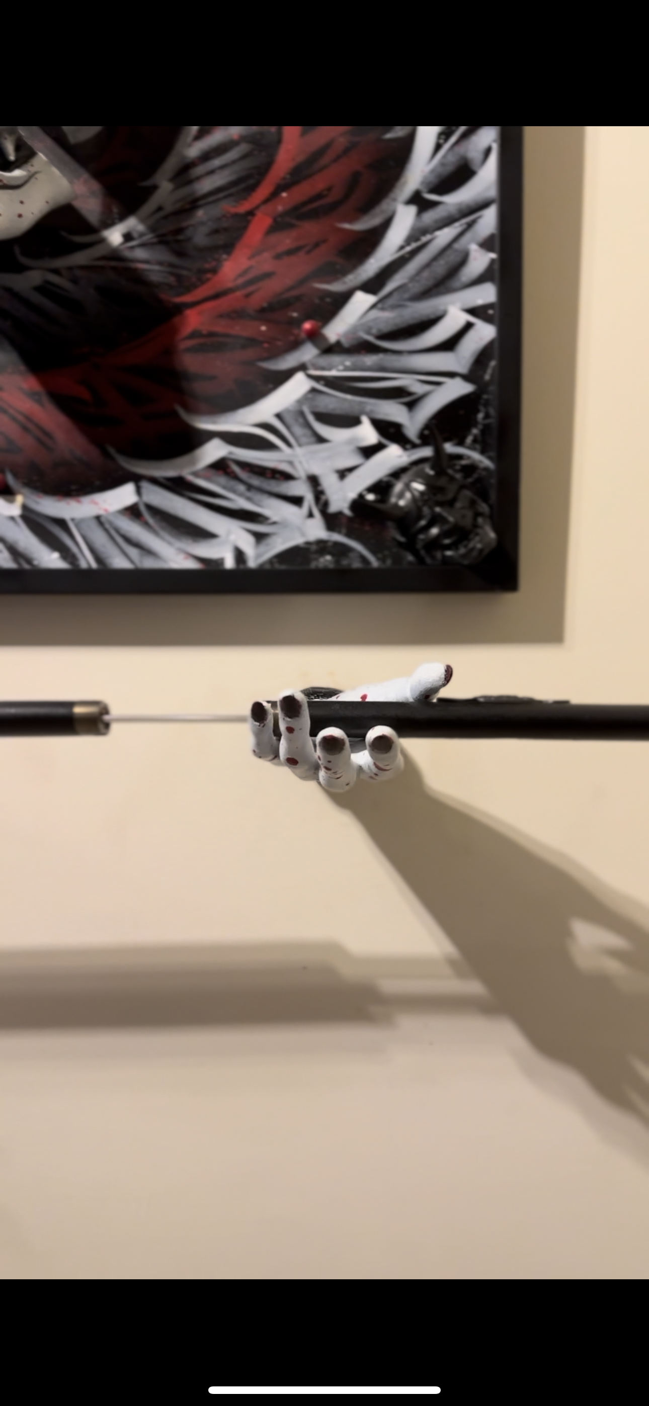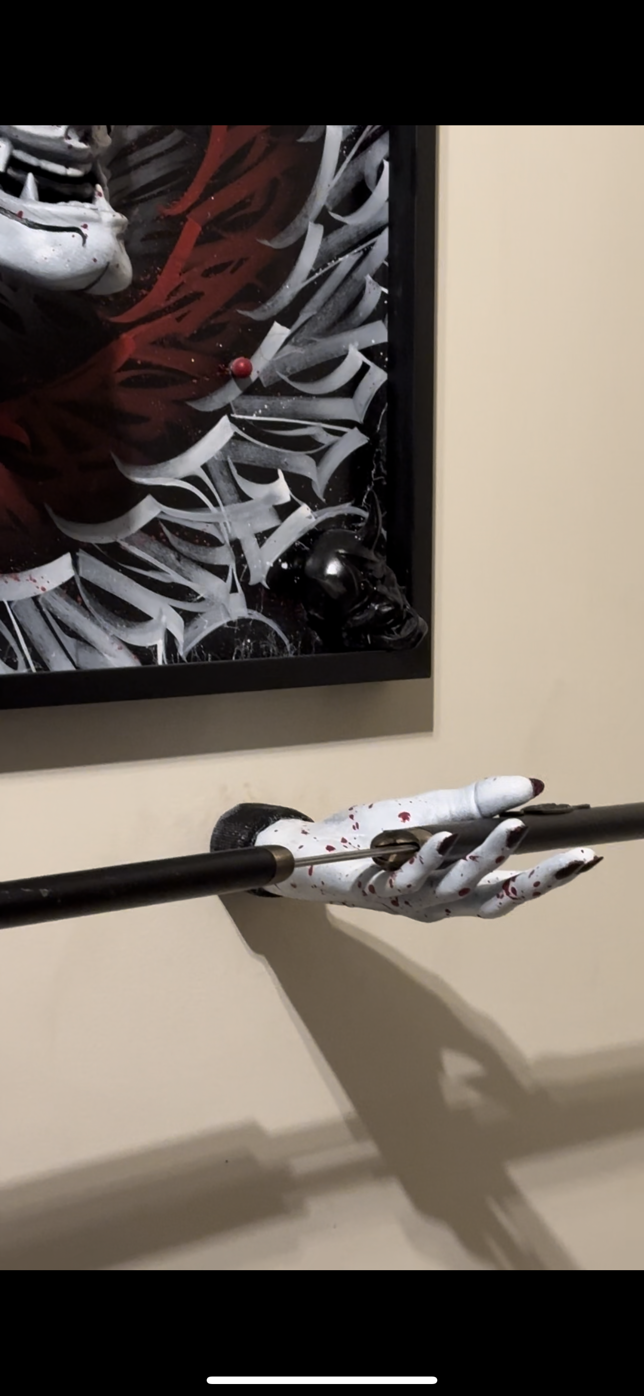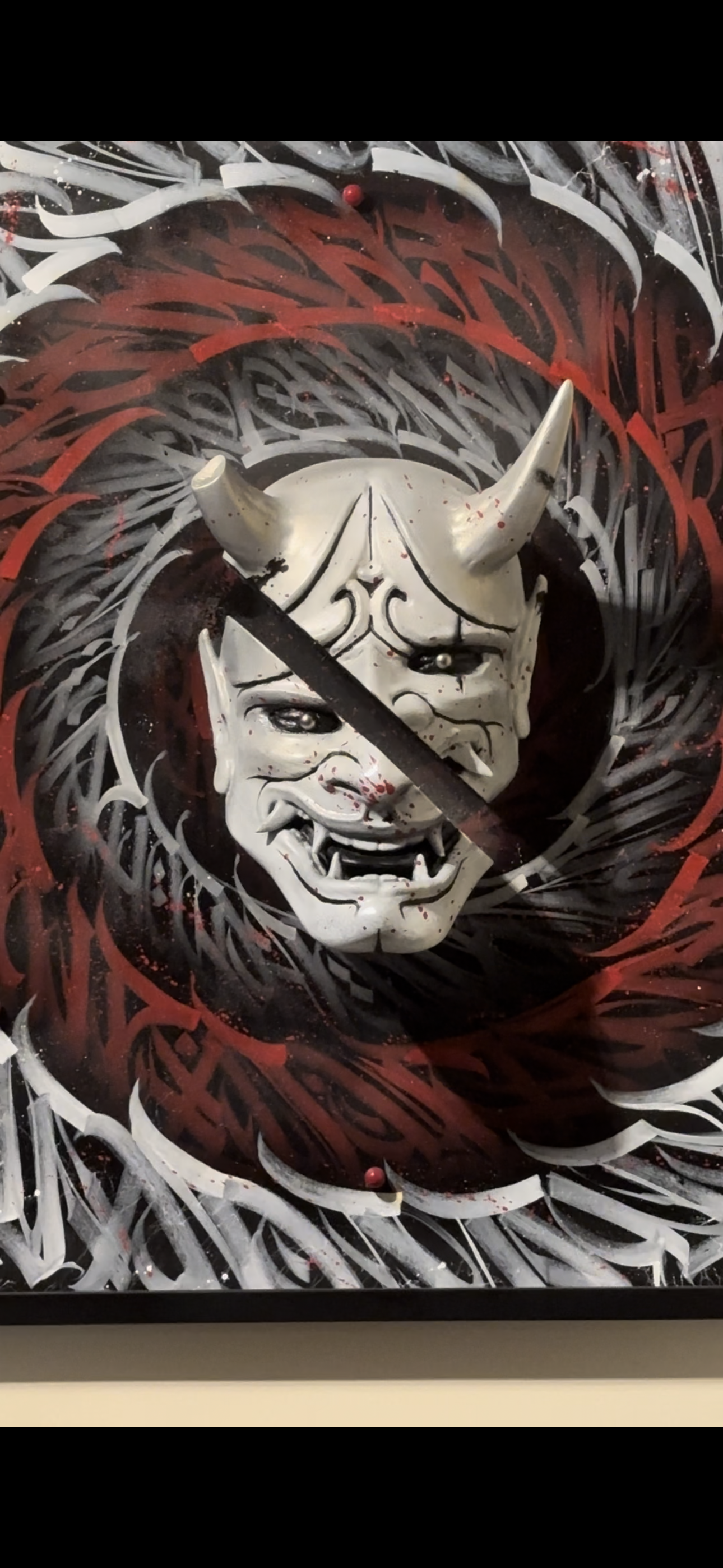 This custom art piece features a 3D-printed Oni mask, complemented by a striking background created in collaboration with the talented artist Scripta. Adding to its dramatic effect, sculpted hands hold a real katana, merging traditional Japanese elements with contemporary art. This unique piece blends craftsmanship and artistry, creating a powerful visual centerpiece.
